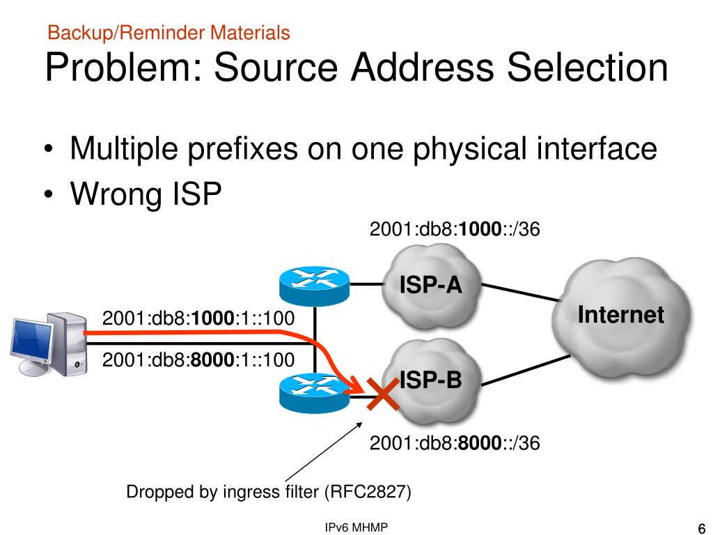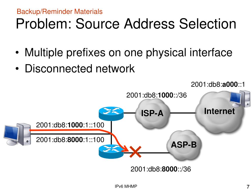 Backup/Reminder Materials Problem: Source Address Selection • Multiple prefixes on one physical interface • Wrong ISP 2001:db8:1000::/36 ISP-A Internet 2001:db8:1000:1::100 2001:db8:8000:1::100 ISP-B 2001:db8:8000::/36 Dropped by ingress filter (RFC2827) 6
