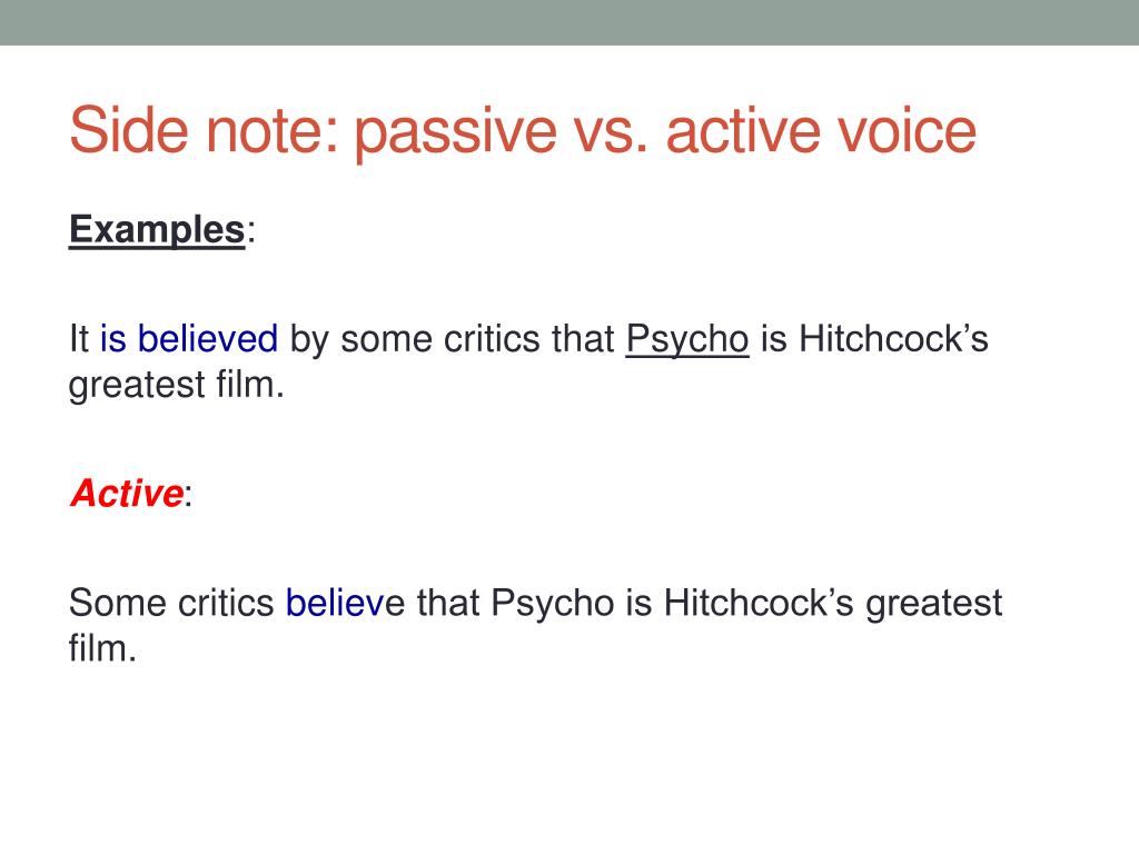 Side note: passive vs. active voice Examples: It is believed by some critics that Psycho is Hitchcock’s greatest film. Active: Some critics believe that Psycho is Hitchcock’s greatest film.