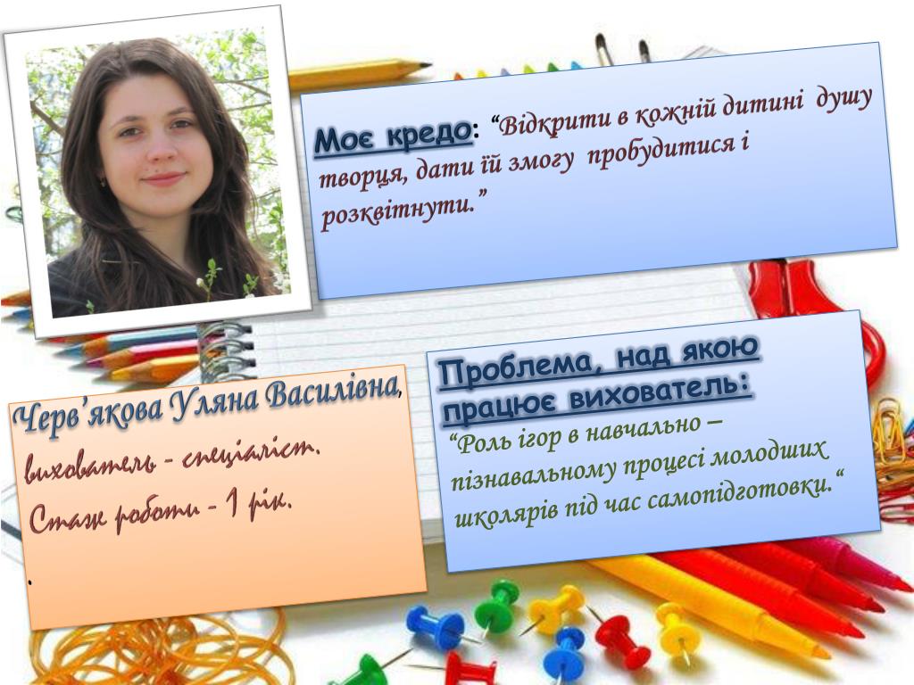 Моє кредо: “Відкрити в кожній дитині душу творця, дати їй змогу пробудитися і розквітнути.” Проблема, над якою працює вихователь: “Роль ігор в навчально – пізнавальному процесі молодших школярів під час самопідготовки.“ Черв’якова Уляна Василівна, вихователь - спеціаліст. Стаж роботи - 1 рік. .