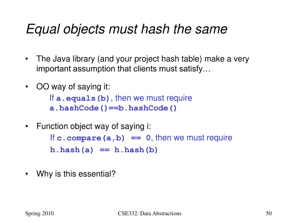 Equal objects must hash the same • The Java library (and your project hash table) make a very important assumption that clients must satisfy… • OO way of saying it: If a.equals(b), then we must require a.hashCode()==b.hashCode() • Function object way of saying i: If c.compare(a,b) == 0, then we must require h.hash(a) == h.hash(b) • Why is this essential? CSE332: Data Abstractions