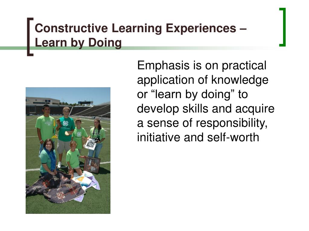 Constructive Learning Experiences – Learn by Doing Emphasis is on practical application of knowledge or “learn by doing” to develop skills and acquire a sense of responsibility, initiative and self-worth
