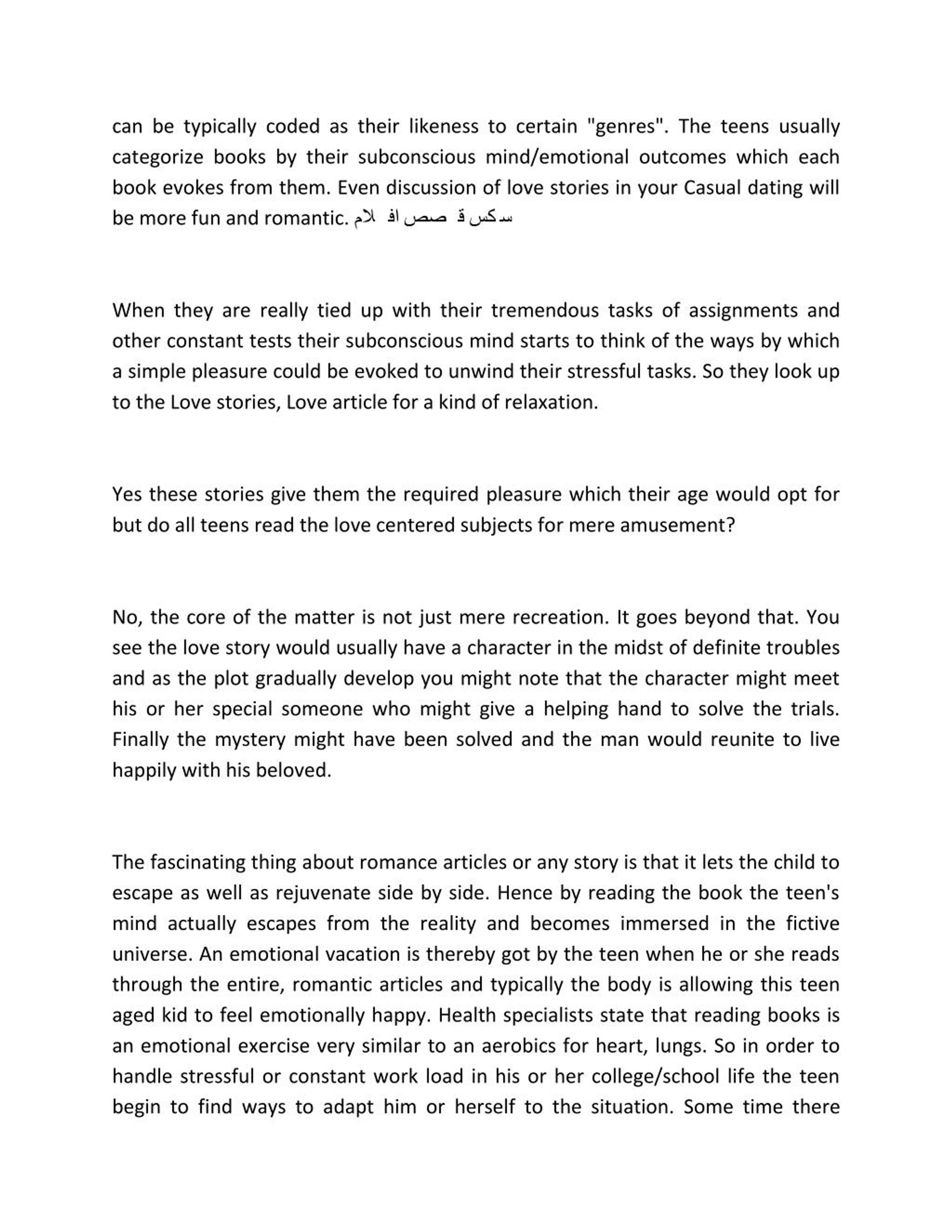 can be typically coded as their likeness to certain "genres". The teens usually categorize books by their subconscious mind/emotional outcomes which each book evokes from them. Even discussion of love stories in your Casual dating will be more fun and romantic. ملا فاصص قسك س When they are really tied up with their tremendous tasks of assignments and other constant tests their subconscious mind starts to think of the ways by which a simple pleasure could be evoked to unwind their stressful tasks. So they look up to the Love stories, Love article for a kind of relaxation. Yes these stories give them the required pleasure which their age would opt for but do all teens read the love centered subjects for mere amusement? No, the core of the matter is not just mere recreation. It goes beyond that. You see the love story would usually have a character in the midst of definite troubles and as the plot gradually develop you might note that the character might meet his or her special someone who might give a helping hand to solve the trials. Finally the mystery might have been solved and the man would reunite to live happily with his beloved. The fascinating thing about romance articles or any story is that it lets the child to escape as well as rejuvenate side by side. Hence by reading the book the teen's mind actually escapes from the reality and becomes immersed in the fictive universe. An emotional vacation is thereby got by the teen when he or she reads through the entire, romantic articles and typically the body is allowing this teen aged kid to feel emotionally happy. Health specialists state that reading books is an emotional exercise very similar to an aerobics for heart, lungs. So in order to handle stressful or constant work load in his or her college/school life the teen begin to find ways to adapt him or herself to the situation. Some time there