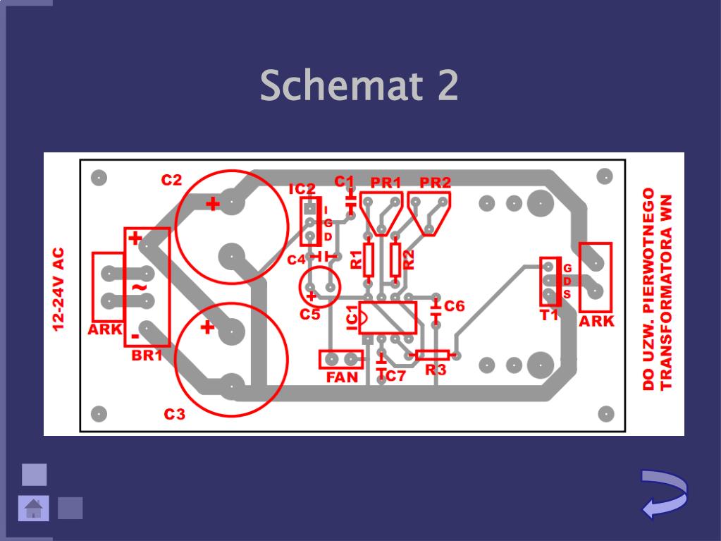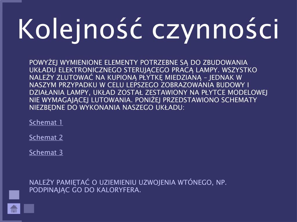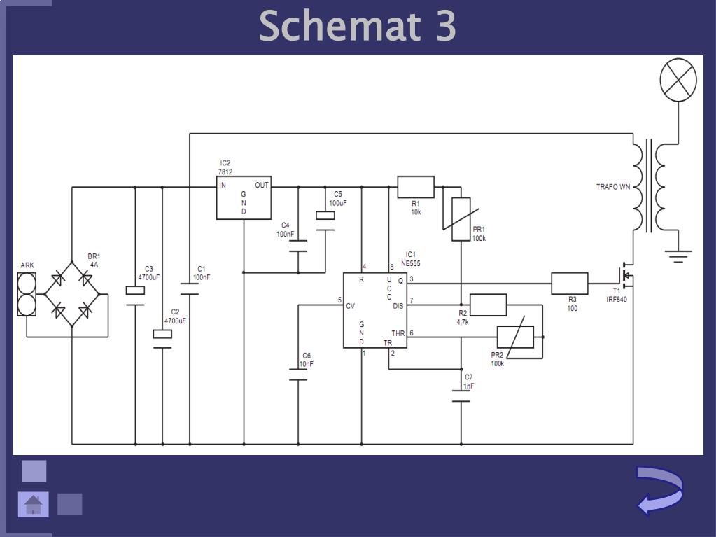 Kolejność czynności POWYŻEJ WYMIENIONE ELEMENTY POTRZEBNE SĄ DO ZBUDOWANIA UKŁADU ELEKTRONICZNEGO STERUJĄCEGO PRACĄ LAMPY. WSZYSTKO NALEŻY ZLUTOWAĆ NA KUPIONĄ PŁYTKĘ MIEDZIANĄ – JEDNAK W NASZYM PRZYPADKU W CELU LEPSZEGO ZOBRAZOWANIA BUDOWY I DZIAŁANIA LAMPY, UKŁAD ZOSTAŁ ZESTAWIONY NA PŁYTCE MODELOWEJ NIE WYMAGAJĄCEJ LUTOWANIA. PONIŻEJ PRZEDSTAWIONO SCHEMATY NIEZBĘDNE DO WYKONANIA NASZEGO UKŁADU: Schemat 1 Schemat 2 Schemat 3 NALEŻY PAMIĘTAĆ O UZIEMIENIU UZWOJENIA WTÓNEGO, NP. PODPINAJĄC GO DO KALORYFERA.
