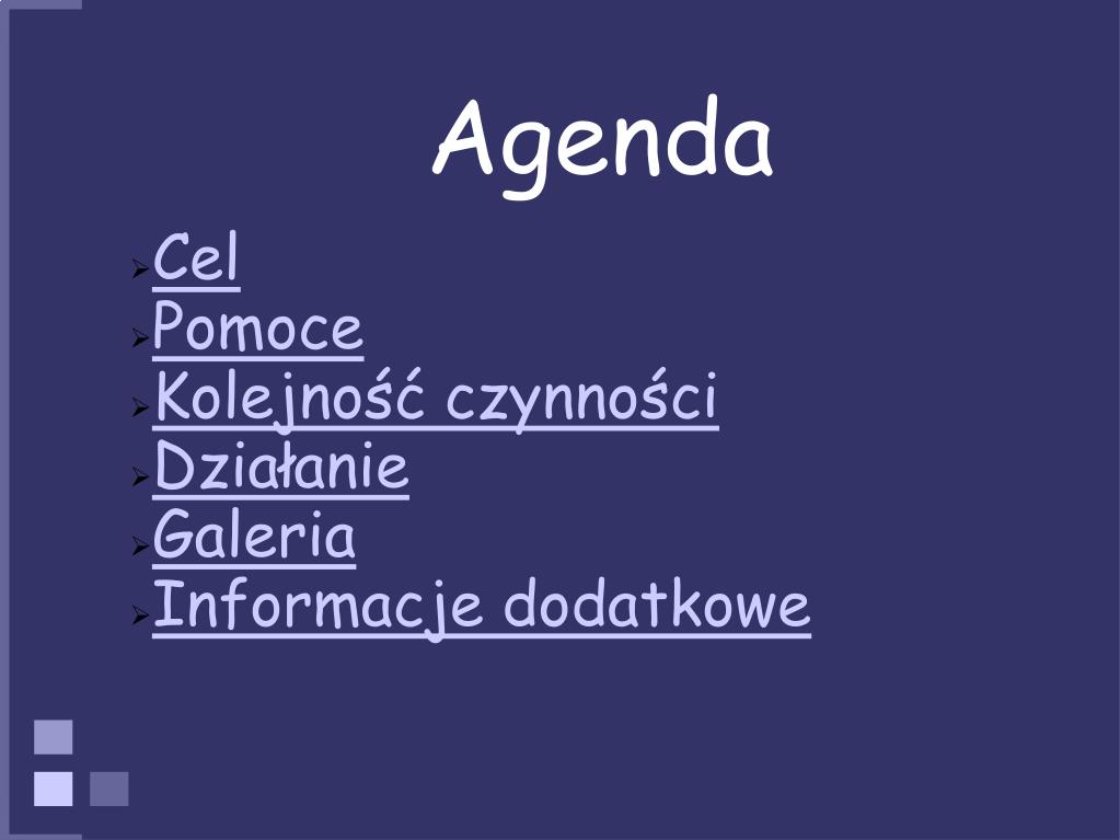 Agenda • Cel • Pomoce • Kolejność czynności • Działanie • Galeria • Informacje dodatkowe