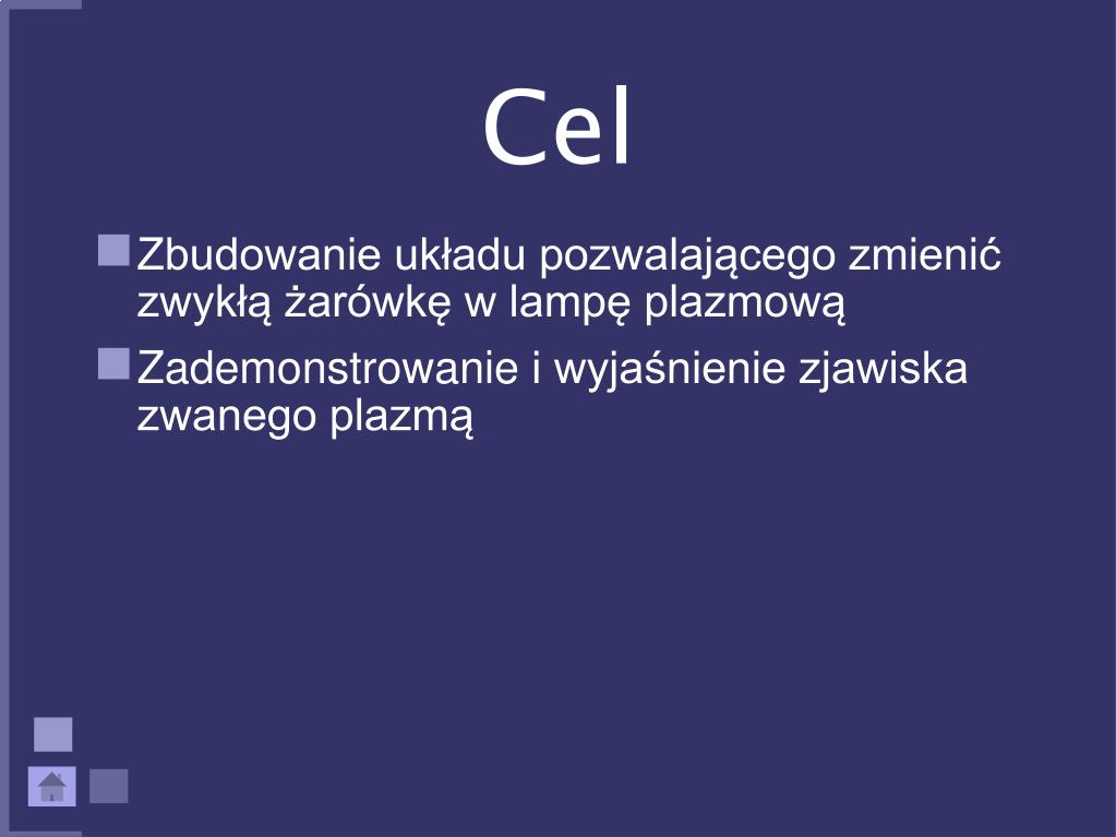 Cel • Zbudowanie układu pozwalającego zmienić zwykłą żarówkę w lampę plazmową • Zademonstrowanie i wyjaśnienie zjawiska zwanego plazmą