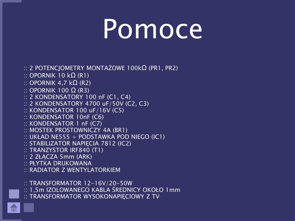 Pomoce :: 2 POTENCJOMETRY MONTAŻOWE 100kΩ (PR1, PR2) :: OPORNIK 10 kΩ (R1) :: OPORNIK 4,7 kΩ (R2) :: OPORNIK 100 Ω (R3) :: 2 KONDENSATORY 100 nF (C1, C4) :: 2 KONDENSATORY 4700 uF/50V (C2, C3) :: KONDENSATOR 100 uF/16V (C5) :: KONDENSATOR 10nF (C6) :: KONDENSATOR 1 nF (C7) :: MOSTEK PROSTOWNICZY 4A (BR1) :: UKŁAD NE555 + PODSTAWKA POD NIEGO (IC1) :: STABILIZATOR NAPIĘCIA 7812 (IC2) :: TRANZYSTOR IRF840 (T1) :: 2 ZŁĄCZA 5mm (ARK) :: PŁYTKA DRUKOWANA :: RADIATOR Z WENTYLATORKIEM :: TRANSFORMATOR 12-16V/20-50W :: 1,5m IZOLOWANEGO KABLA ŚREDNICY OKOŁO 1mm :: TRANSFORMATOR WYSOKONAPIĘCIOWY Z TV