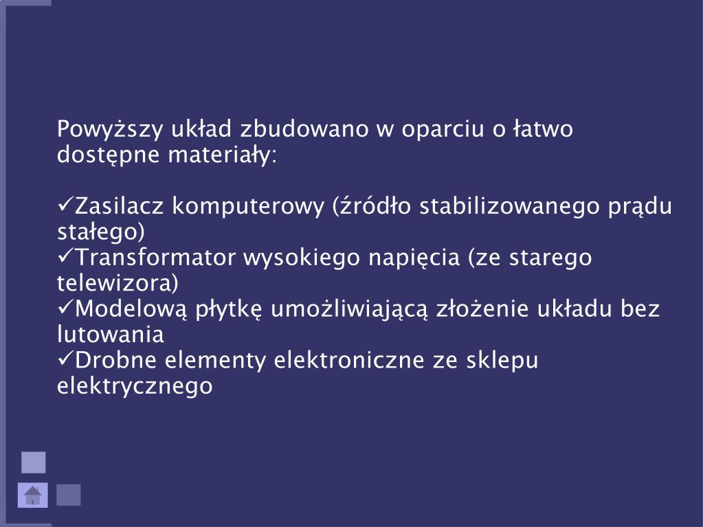 Powyższy układ zbudowano w oparciu o łatwo dostępne materiały: • Zasilacz komputerowy (źródło stabilizowanego prądu stałego) • Transformator wysokiego napięcia (ze starego telewizora) • Modelową płytkę umożliwiającą złożenie układu bez lutowania • Drobne elementy elektroniczne ze sklepu elektrycznego