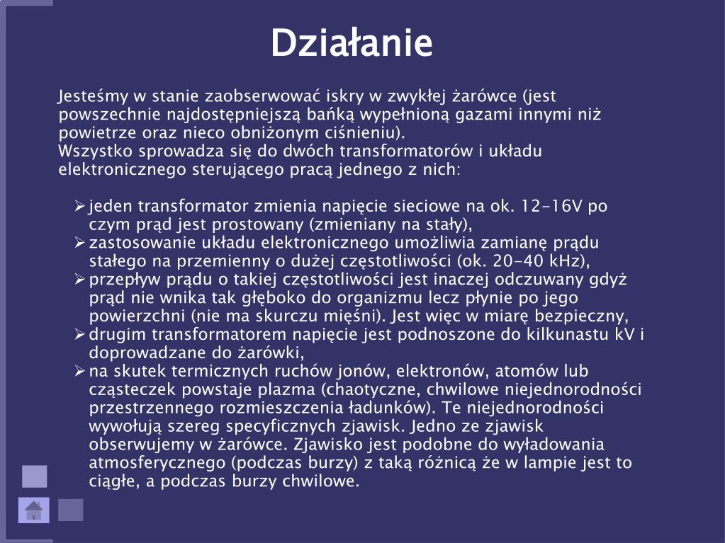 Działanie • Jesteśmy w stanie zaobserwować iskry w zwykłej żarówce (jest powszechnie najdostępniejszą bańką wypełnioną gazami innymi niż powietrze oraz nieco obniżonym ciśnieniu). • Wszystko sprowadza się do dwóch transformatorów i układu elektronicznego sterującego pracą jednego z nich: • jeden transformator zmienia napięcie sieciowe na ok. 12-16V po czym prąd jest prostowany (zmieniany na stały), • zastosowanie układu elektronicznego umożliwia zamianę prądu stałego na przemienny o dużej częstotliwości (ok. 20-40 kHz), • przepływ prądu o takiej częstotliwości jest inaczej odczuwany gdyż prąd nie wnika tak głęboko do organizmu lecz płynie po jego powierzchni (nie ma skurczu mięśni). Jest więc w miarę bezpieczny, • drugim transformatorem napięcie jest podnoszone do kilkunastu kV i doprowadzane do żarówki, • na skutek termicznych ruchów jonów, elektronów, atomów lub cząsteczek powstaje plazma (chaotyczne, chwilowe niejednorodności przestrzennego rozmieszczenia ładunków). Te niejednorodności wywołują szereg specyficznych zjawisk. Jedno ze zjawisk obserwujemy w żarówce. Zjawisko jest podobne do wyładowania atmosferycznego (podczas burzy) z taką różnicą że w lampie jest to ciągłe, a podczas burzy chwilowe.