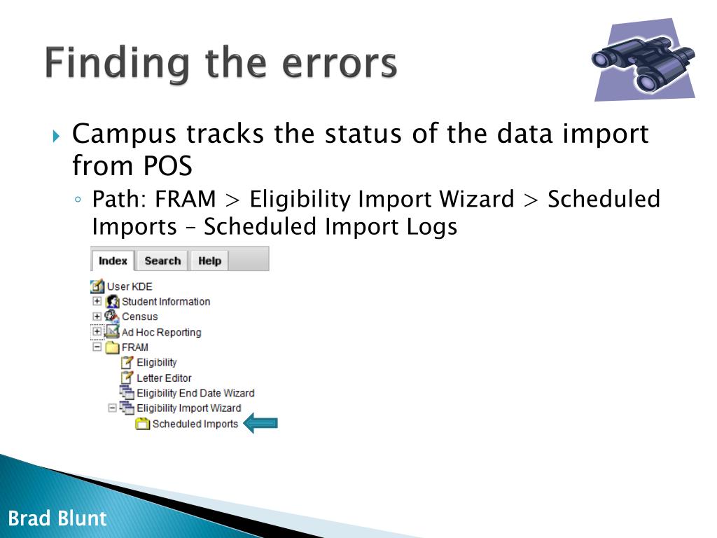 Finding the errors • Campus tracks the status of the data import from POS • Path: FRAM > Eligibility Import Wizard > Scheduled Imports – Scheduled Import Logs Brad Blunt