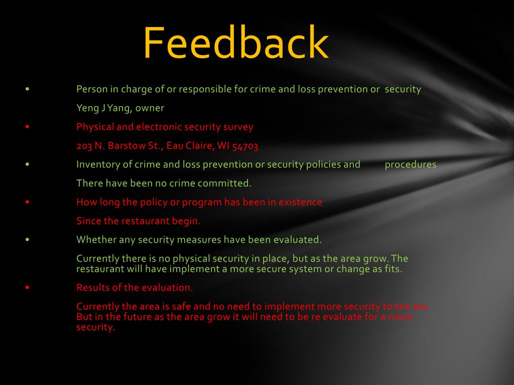 Feedback • • Person in charge of or responsible for crime and loss prevention or security • Yeng J Yang, owner • • Physical and electronic security survey • 203 N. Barstow St., Eau Claire, WI 54703 • • Inventory of crime and loss prevention or security policies and procedures • There have been no crime committed. • • How long the policy or program has been in existence • Since the restaurant begin. • • Whether any security measures have been evaluated. • Currently there is no physical security in place, but as the area grow. The restaurant will have implement a more secure system or change as fits. • • Results of the evaluation. • Currently the area is safe and no need to implement more security to the are. But in the future as the area grow it will need to be re evaluate for a more security.