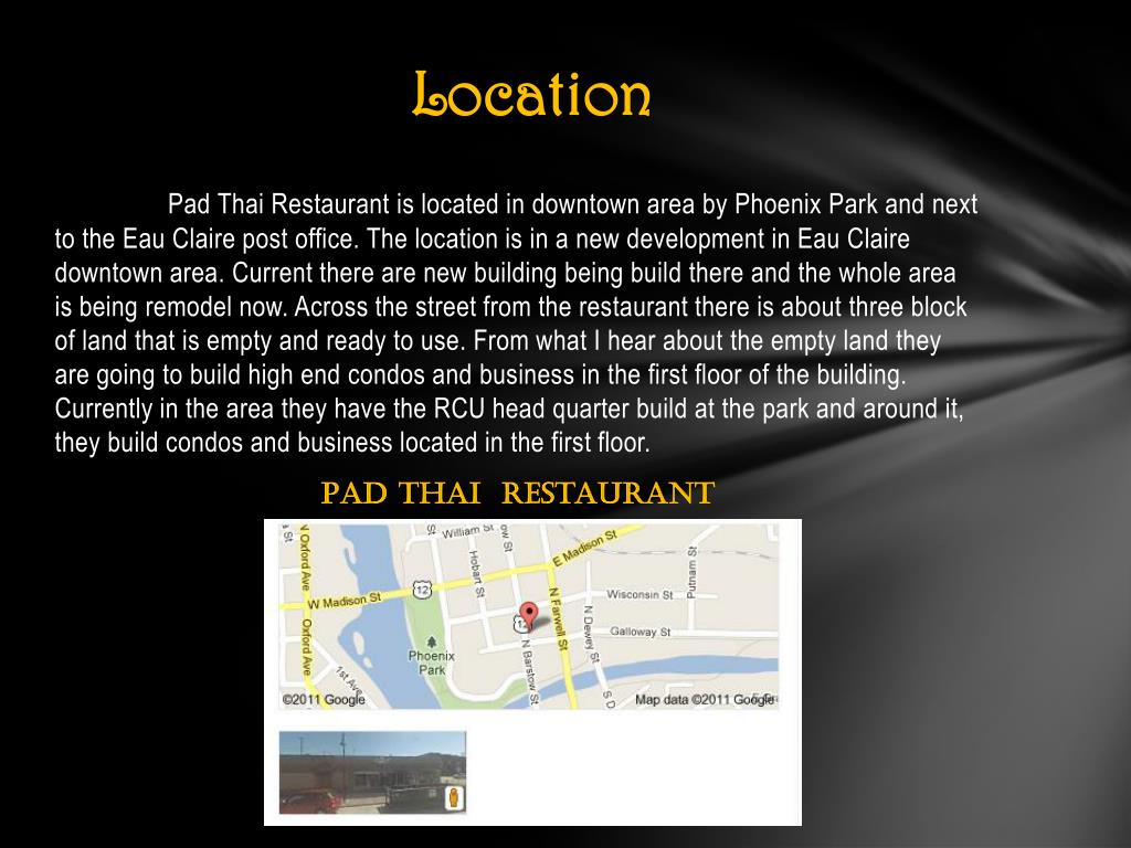 Location • Pad Thai Restaurant is located in downtown area by Phoenix Park and next to the Eau Claire post office. The location is in a new development in Eau Claire downtown area. Current there are new building being build there and the whole area is being remodel now. Across the street from the restaurant there is about three block of land that is empty and ready to use. From what I hear about the empty land they are going to build high end condos and business in the first floor of the building. Currently in the area they have the RCU head quarter build at the park and around it, they build condos and business located in the first floor. • Pad Thai Restaurant