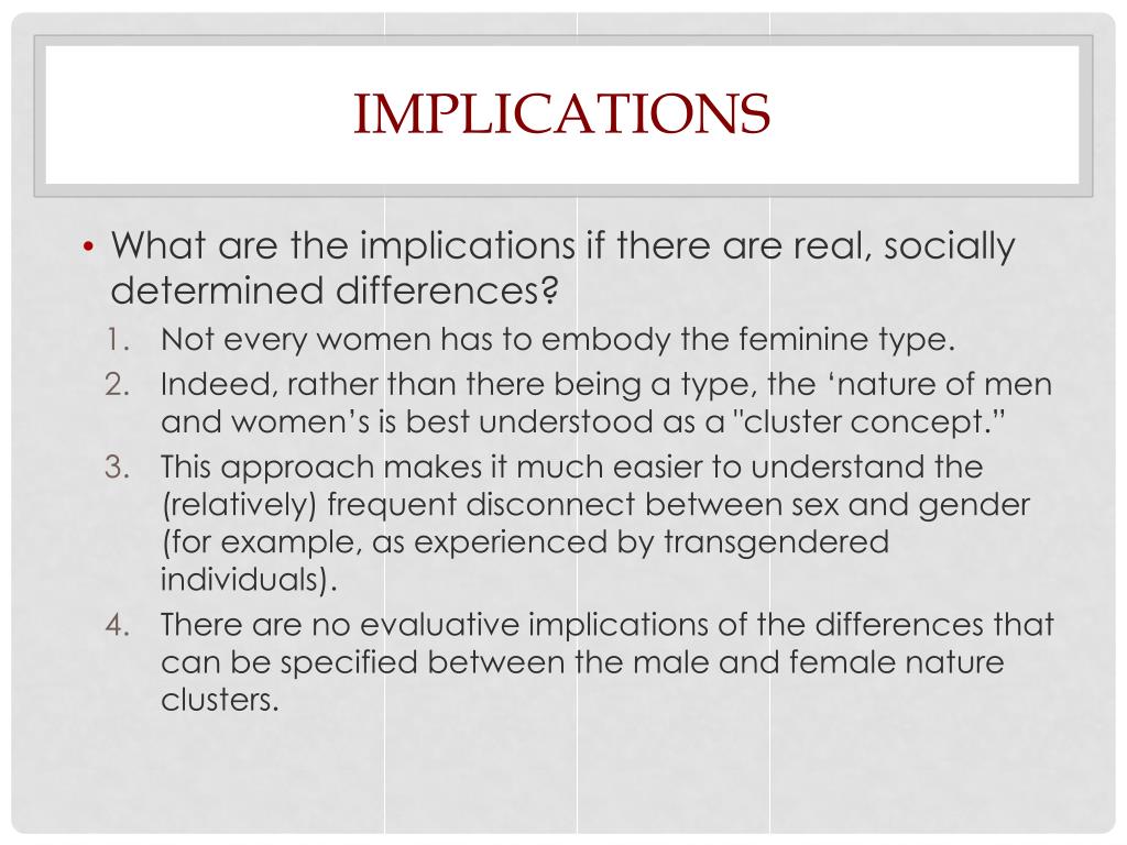 Implications • What are the implications if there are real, socially determined differences? • Not every women has to embody the feminine type. • Indeed, rather than there being a type, the ‘nature of men and women’s is best understood as a "cluster concept.” • This approach makes it much easier to understand the (relatively) frequent disconnect between sex and gender (for example, as experienced by transgendered individuals). • There are no evaluative implications of the differences that can be specified between the male and female nature clusters.