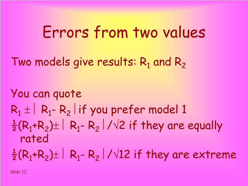 Errors from two values Two models give results: R1 and R2 You can quote R1 R1- R2if you prefer model 1 ½(R1+R2) R1- R2/2 if they are equally rated ½(R1+R2) R1- R2/12 if they are extreme