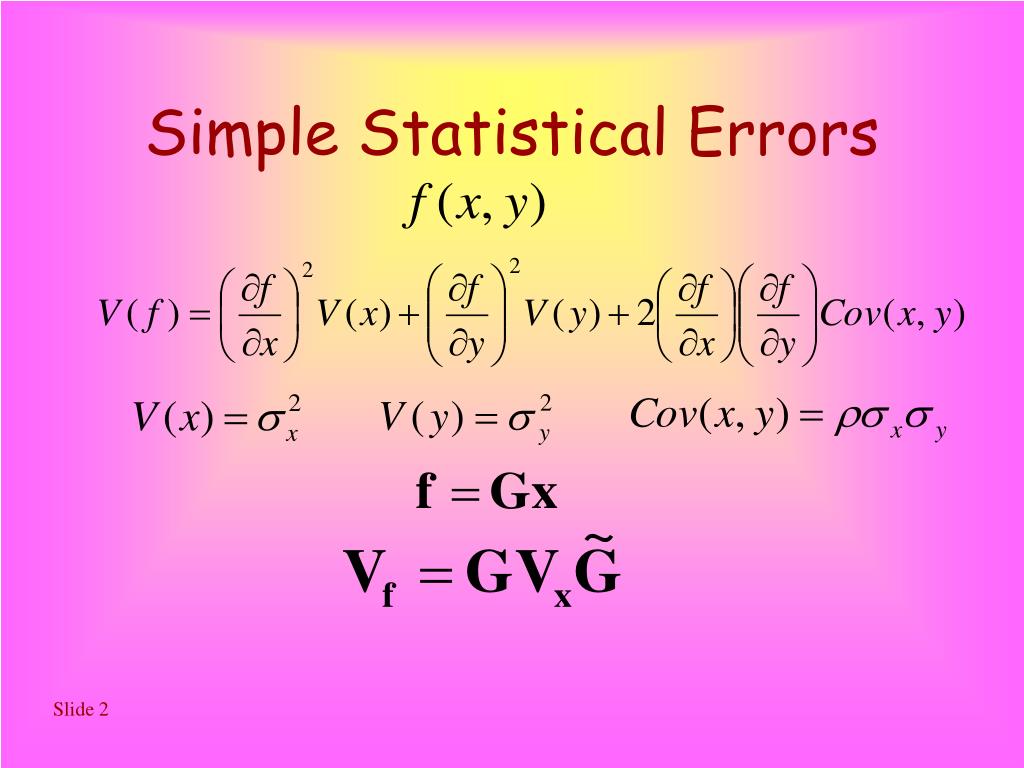 Statistics for HEP Roger Barlow Manchester University. Lecture 5: Errors. Simple Statistical Errors. Correlation: examples. Efficiency (etc) r=N/N T. Avoid by using r=N/(N+N R ). Extrapolate Y=mX+c. Avoid by using y=m(x- x) +c’. Using the Covariance Matrix.