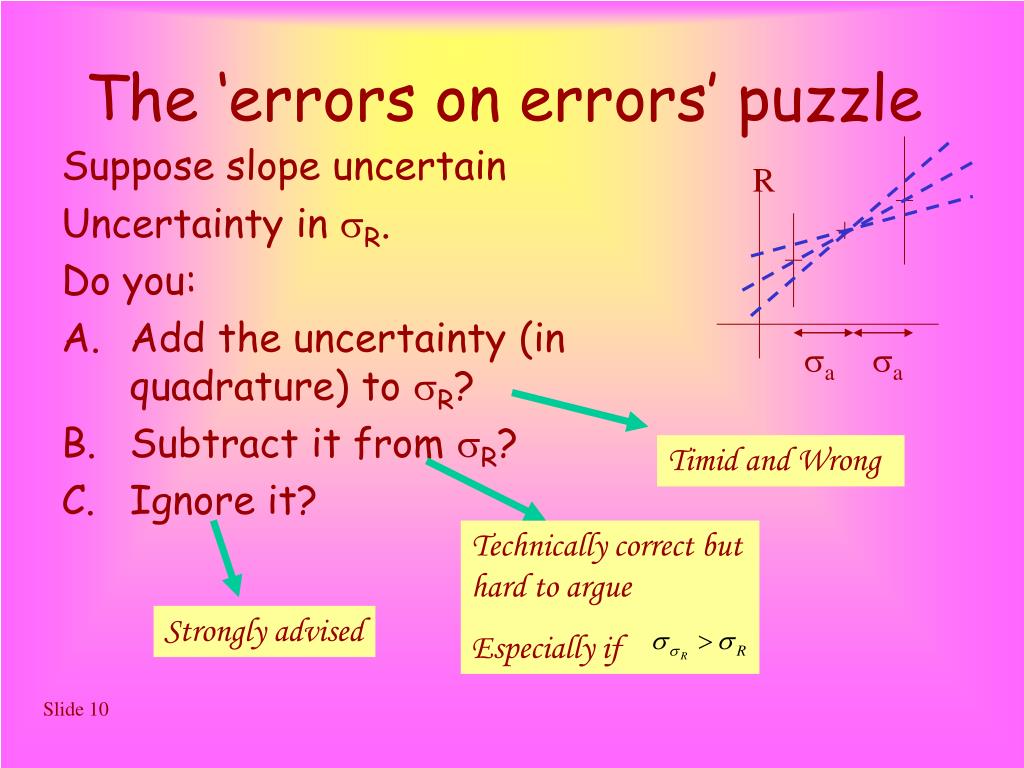 The ‘errors on errors’ puzzle R Suppose slope uncertain Uncertainty in R. Do you: • Add the uncertainty (in quadrature) to R? • Subtract it from R? • Ignore it? a a Timid and Wrong Technically correct but hard to argue Especially if Strongly advised