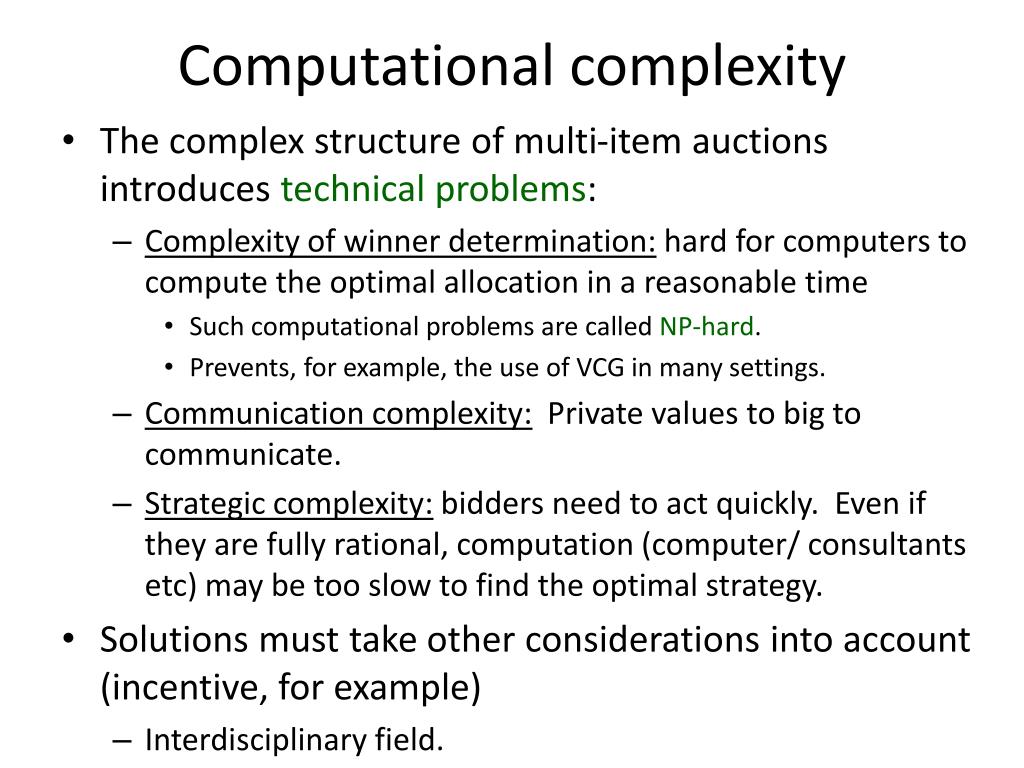 Computational complexity • The complex structure of multi-item auctions introduces technical problems: • Complexity of winner determination: hard for computers to compute the optimal allocation in a reasonable time • Such computational problems are called NP-hard. • Prevents, for example, the use of VCG in many settings. • Communication complexity: Private values to big to communicate. • Strategic complexity: bidders need to act quickly. Even if they are fully rational, computation (computer/ consultants etc) may be too slow to find the optimal strategy. • Solutions must take other considerations into account (incentive, for example) • Interdisciplinary field.