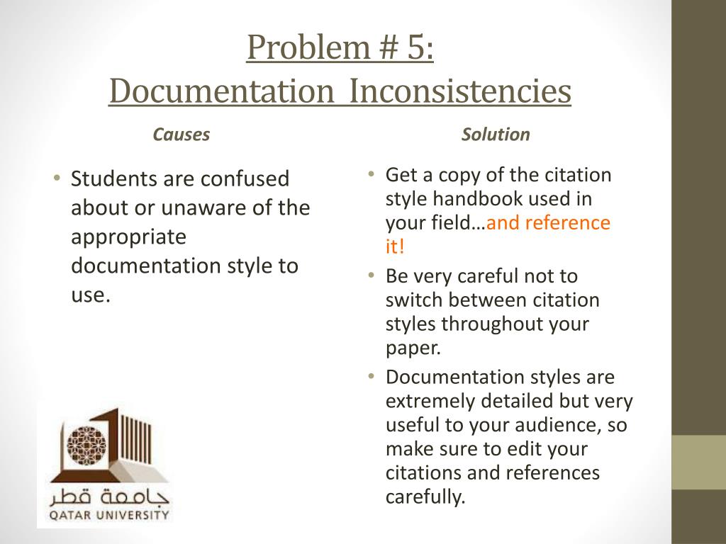 Problem # 5: Documentation Inconsistencies Causes Solution Get a copy of the citation style handbook used in your field…and reference it! Be very careful not to switch between citation styles throughout your paper. Documentation styles are extremely detailed but very useful to your audience, so make sure to edit your citations and references carefully. • Students are confused about or unaware of the appropriate documentation style to use.
