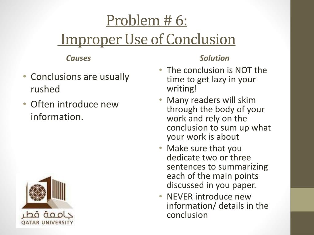 Problem # 6: Improper Use of Conclusion Causes Solution The conclusion is NOT the time to get lazy in your writing! Many readers will skim through the body of your work and rely on the conclusion to sum up what your work is about Make sure that you dedicate two or three sentences to summarizing each of the main points discussed in you paper. NEVER introduce new information/ details in the conclusion • Conclusions are usually rushed • Often introduce new information.