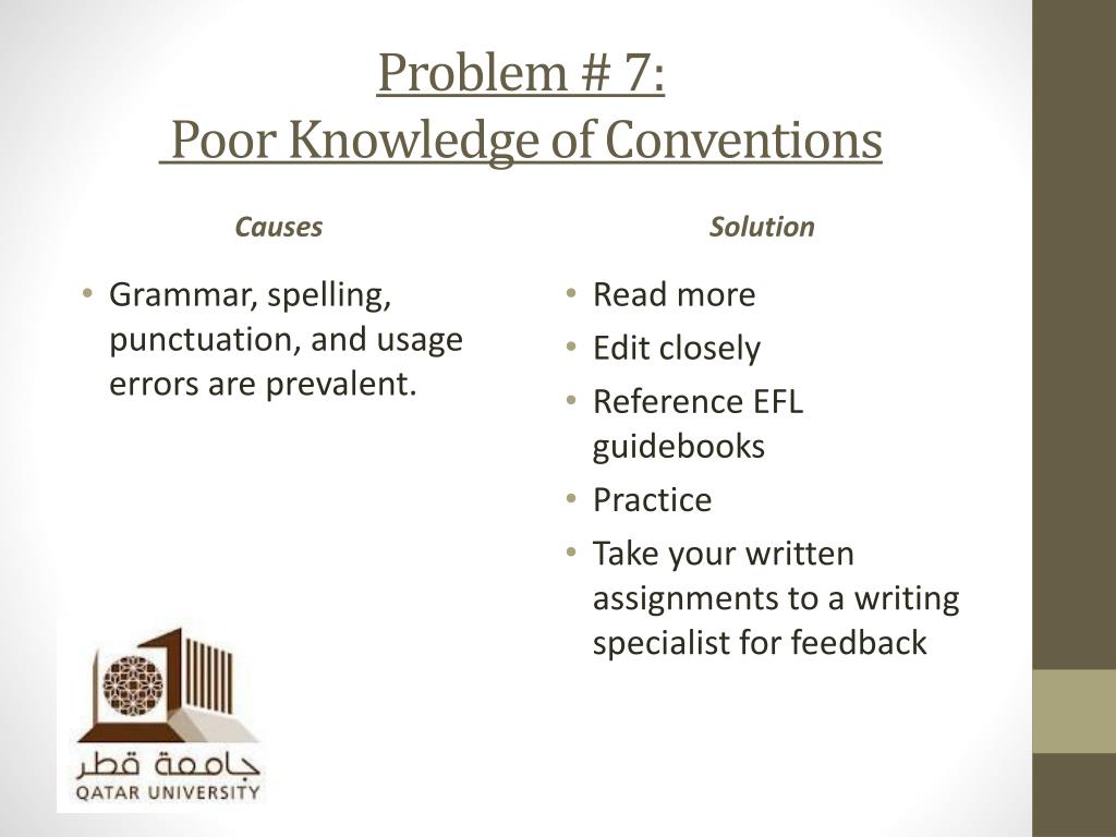 Problem # 7: Poor Knowledge of Conventions Causes Solution Read more Edit closely Reference EFL guidebooks Practice Take your written assignments to a writing specialist for feedback • Grammar, spelling, punctuation, and usage errors are prevalent.