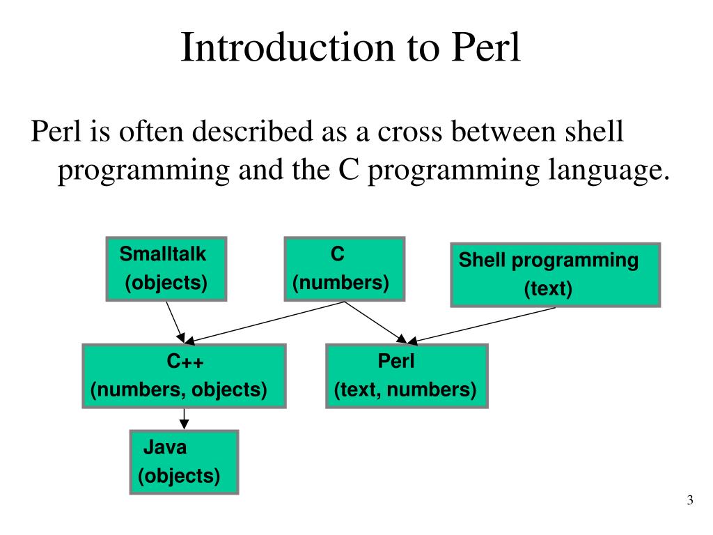 Introduction to Perl Perl is often described as a cross between shell programming and the C programming language. Smalltalk (objects) C (numbers) Shell programming (text) C++ (numbers, objects) Perl (text, numbers) Java (objects)