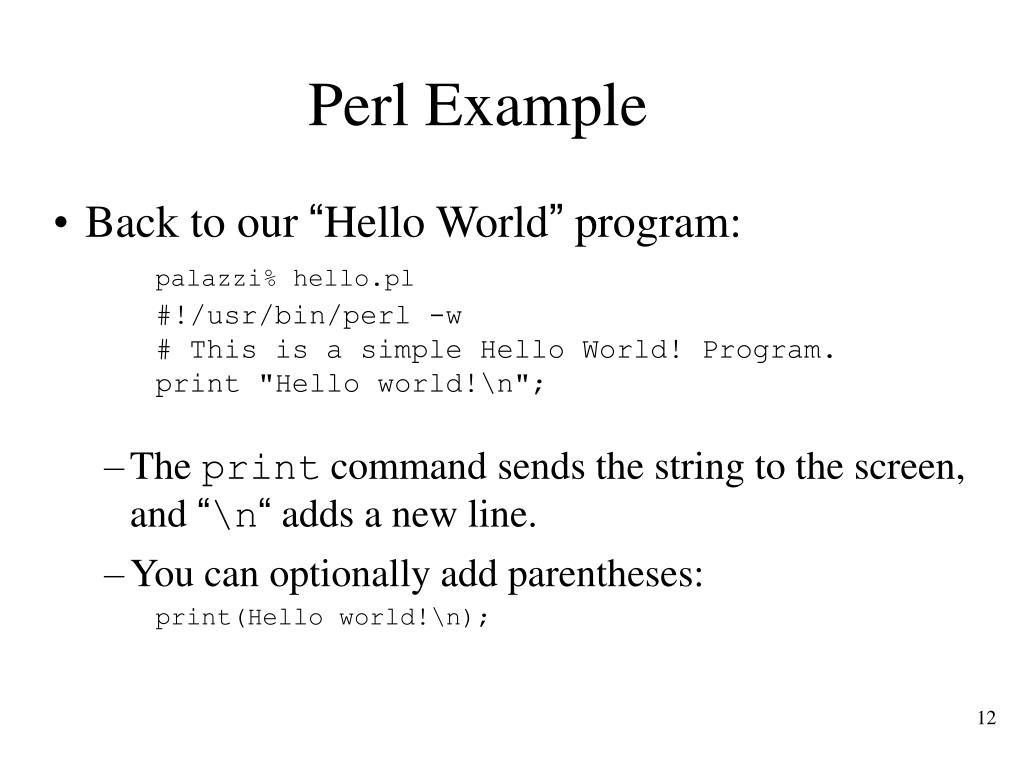 Perl Example • Back to our “Hello World” program: palazzi% hello.pl #!/usr/bin/perl -w # This is a simple Hello World! Program. print "Hello world!\n"; • The print command sends the string to the screen, and “\n“ adds a new line. • You can optionally add parentheses: print(Hello world!\n);