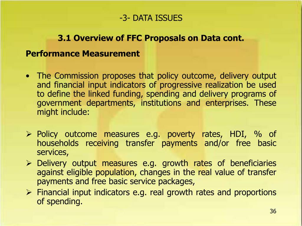 -3- DATA ISSUES3.1 Overview of FFC Proposals on Data cont. Performance Measurement • The Commission proposes that policy outcome, delivery output and financial input indicators of progressive realization be used to define the linked funding, spending and delivery programs of government departments, institutions and enterprises. These might include: • Policy outcome measures e.g. poverty rates, HDI, % of households receiving transfer payments and/or free basic services, • Delivery output measures e.g. growth rates of beneficiaries against eligible population, changes in the real value of transfer payments and free basic service packages, • Financial input indicators e.g. real growth rates and proportions of spending.