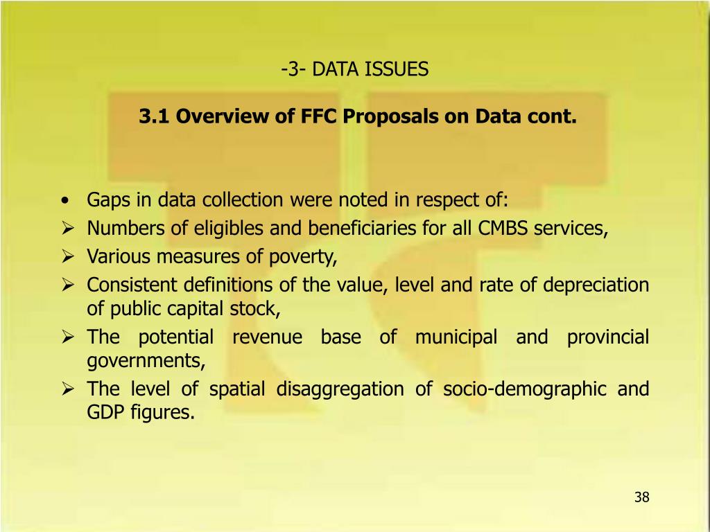 -3- DATA ISSUES3.1 Overview of FFC Proposals on Data cont. • Gaps in data collection were noted in respect of: • Numbers of eligibles and beneficiaries for all CMBS services, • Various measures of poverty, • Consistent definitions of the value, level and rate of depreciation of public capital stock, • The potential revenue base of municipal and provincial governments, • The level of spatial disaggregation of socio-demographic and GDP figures.