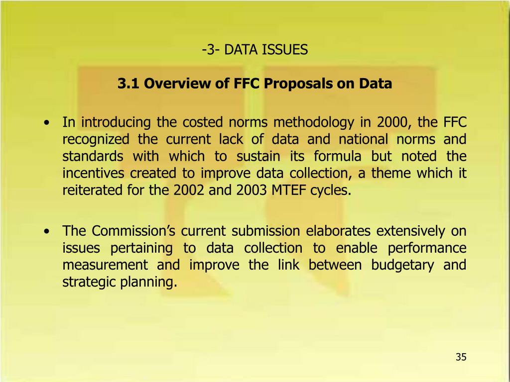 -3- DATA ISSUES3.1 Overview of FFC Proposals on Data • In introducing the costed norms methodology in 2000, the FFC recognized the current lack of data and national norms and standards with which to sustain its formula but noted the incentives created to improve data collection, a theme which it reiterated for the 2002 and 2003 MTEF cycles. • The Commission’s current submission elaborates extensively on issues pertaining to data collection to enable performance measurement and improve the link between budgetary and strategic planning.