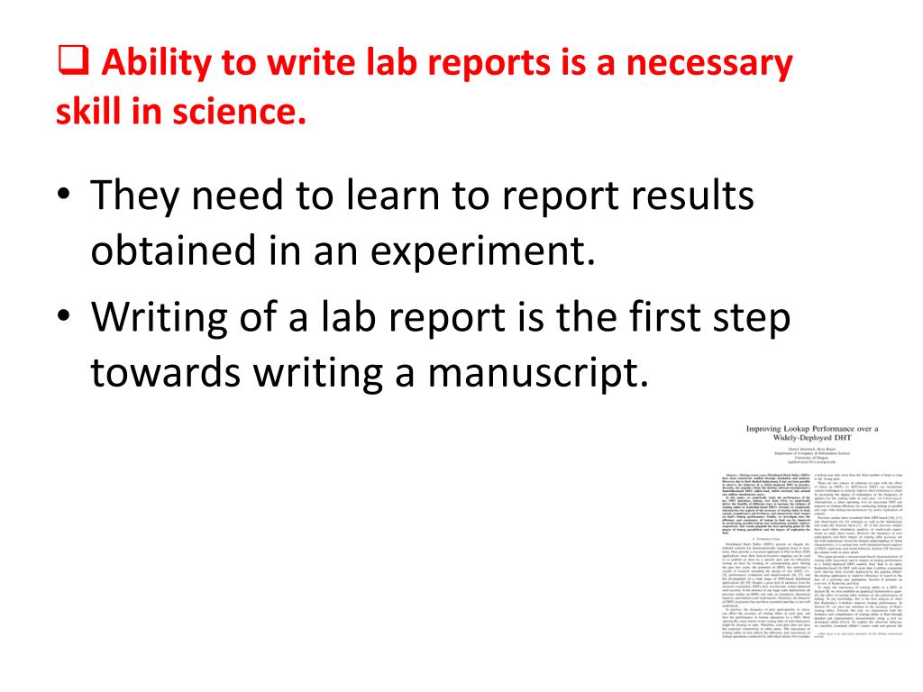 Ability to write lab reports is a necessary skill in science. • They need to learn to report results obtained in an experiment. • Writing of a lab report is the first step towards writing a manuscript.