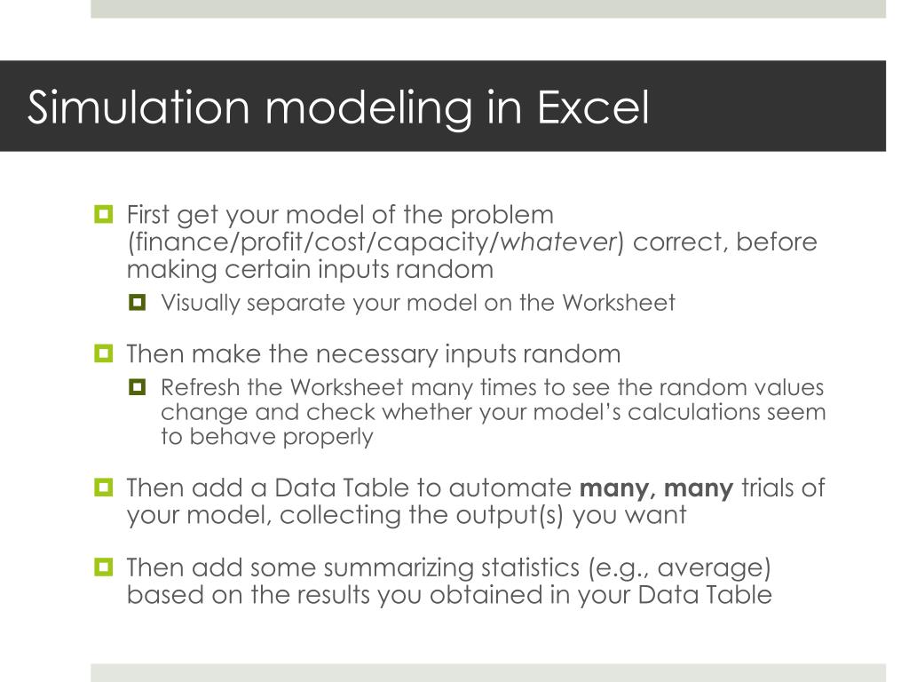 Simulation modeling in Excel • First get your model of the problem (finance/profit/cost/capacity/whatever) correct, before making certain inputs random • Visually separate your model on the Worksheet • Then make the necessary inputs random • Refresh the Worksheet many times to see the random values change and check whether your model’s calculations seem to behave properly • Then add a Data Table to automate many, many trials of your model, collecting the output(s) you want • Then add some summarizing statistics (e.g., average) based on the results you obtained in your Data Table