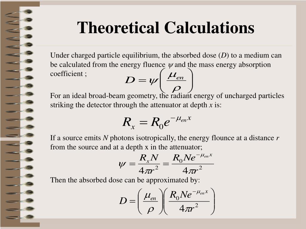 Theoretical Calculations Under charged particle equilibrium, the absorbed dose (D) to a medium can be calculated from the energy fluence and the mass energy absorption coefficient ; For an ideal broad-beam geometry, the radiant energy of uncharged particles striking the detector through the attenuator at depth x is: If a source emits N photons isotropically, the energy flounce at a distance r from the source and at a depth x in the attenuator; Then the absorbed dose can be approximated by: