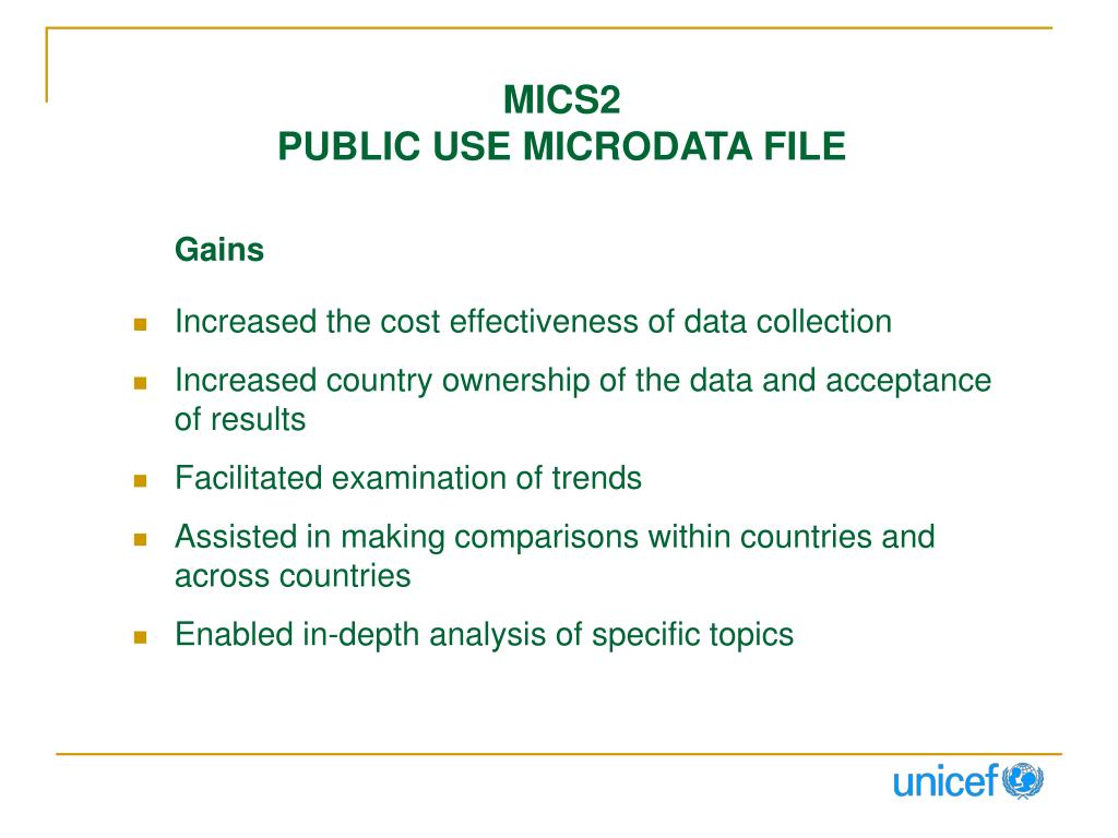 MICS2PUBLIC USE MICRODATA FILE Gains • Increased the cost effectiveness of data collection • Increased country ownership of the data and acceptance of results • Facilitated examination of trends • Assisted in making comparisons within countries and across countries • Enabled in-depth analysis of specific topics