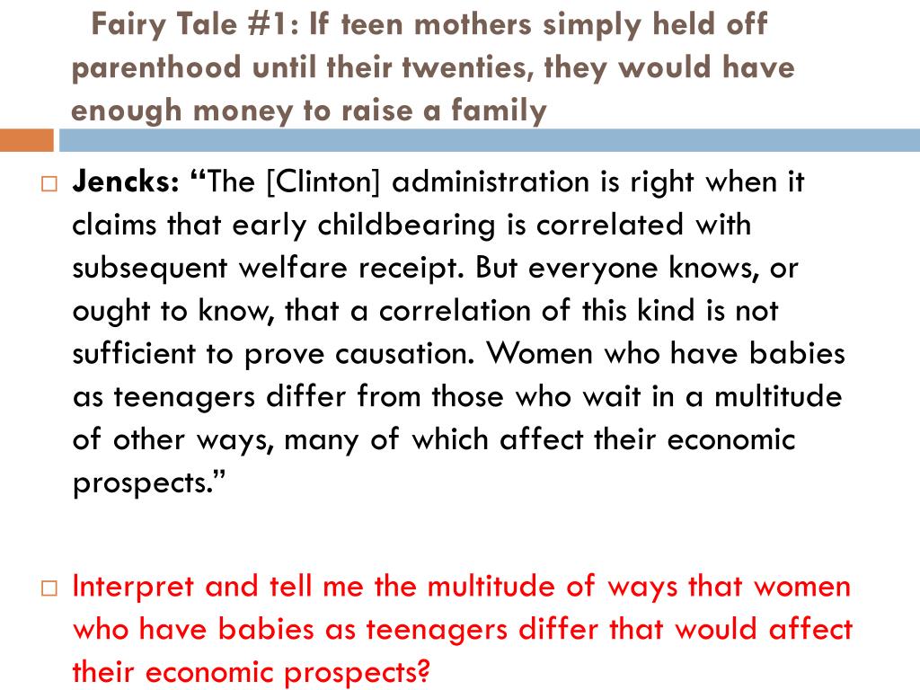 Fairy Tale #1: If teen mothers simply held off parenthood until their twenties, they would have enough money to raise a family Jencks: “The [Clinton] administration is right when it claims that early childbearing is correlated with subsequent welfare receipt. But everyone knows, or ought to know, that a correlation of this kind is not sufficient to prove causation. Women who have babies as teenagers differ from those who wait in a multitude of other ways, many of which affect their economic prospects.” Interpret and tell me the multitude of ways that women who have babies as teenagers differ that would affect their economic prospects?