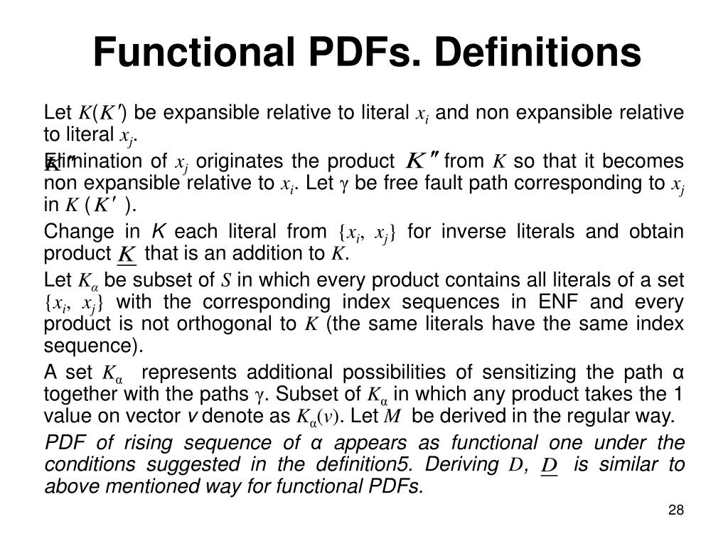 Functional PDFs. Notions Consider product __ comprising literal xi corresponding to path α. LetK be derived from __ with elimination of repeated literals. Product K is expansible relative to xi. (In the expression S the product _________ is expansible relative to d). If we want to derive from K new product which is not function implicant (S represents function), then we must exclude certain subset of literals together with xi. Let Xj be minimal subset of literals that originates the product __ from (___) K so that ___ is not expansible relative to xi. Let δ be subset of paths corresponding to Xjin __ and K. Each path from δ is free fault. Next change in K each literal from {xi, Xj} for inverse literal and obtain product __. __ is called an addition of K relative to literals {xi, Xj}.
