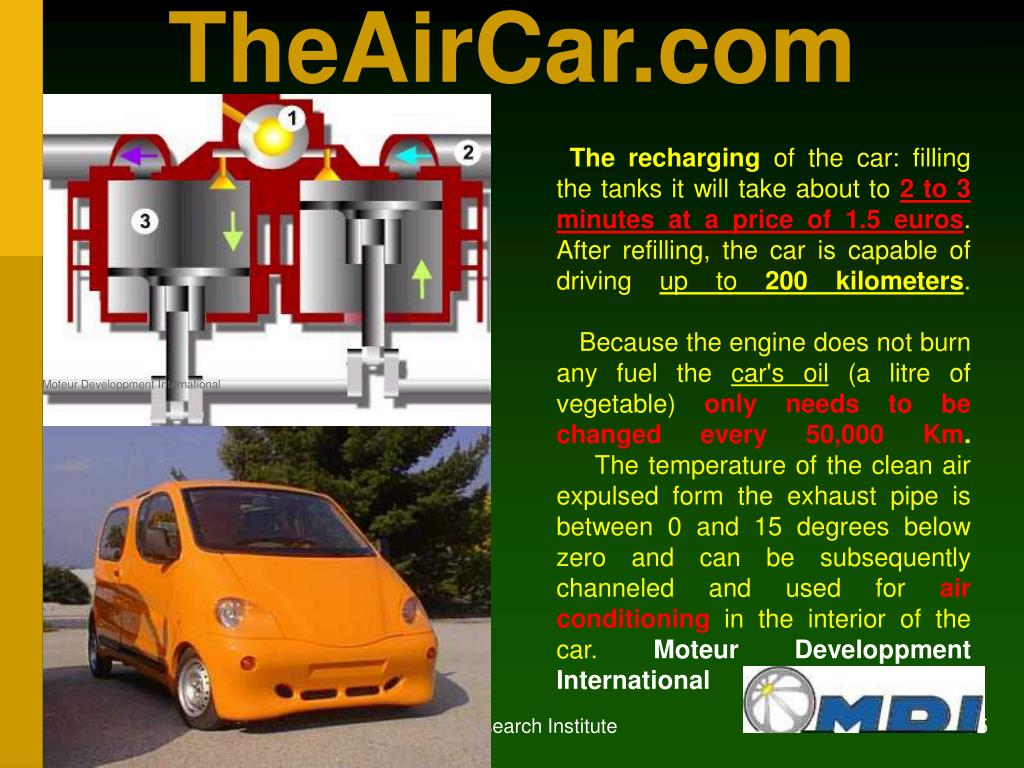 TheAirCar.com The recharging of the car: filling the tanks it will take about to 2 to 3 minutes at a price of 1.5 euros. After refilling, the car is capable of driving up to 200 kilometers. Because the engine does not burn any fuel the car's oil (a litre of vegetable) only needs to be changed every 50,000 Km. The temperature of the clean air expulsed form the exhaust pipe is between 0 and 15 degrees below zero and can be subsequently channeled and used for air conditioning in the interior of the car. Moteur Developpment International Moteur Developpment International Integrity Research Institute