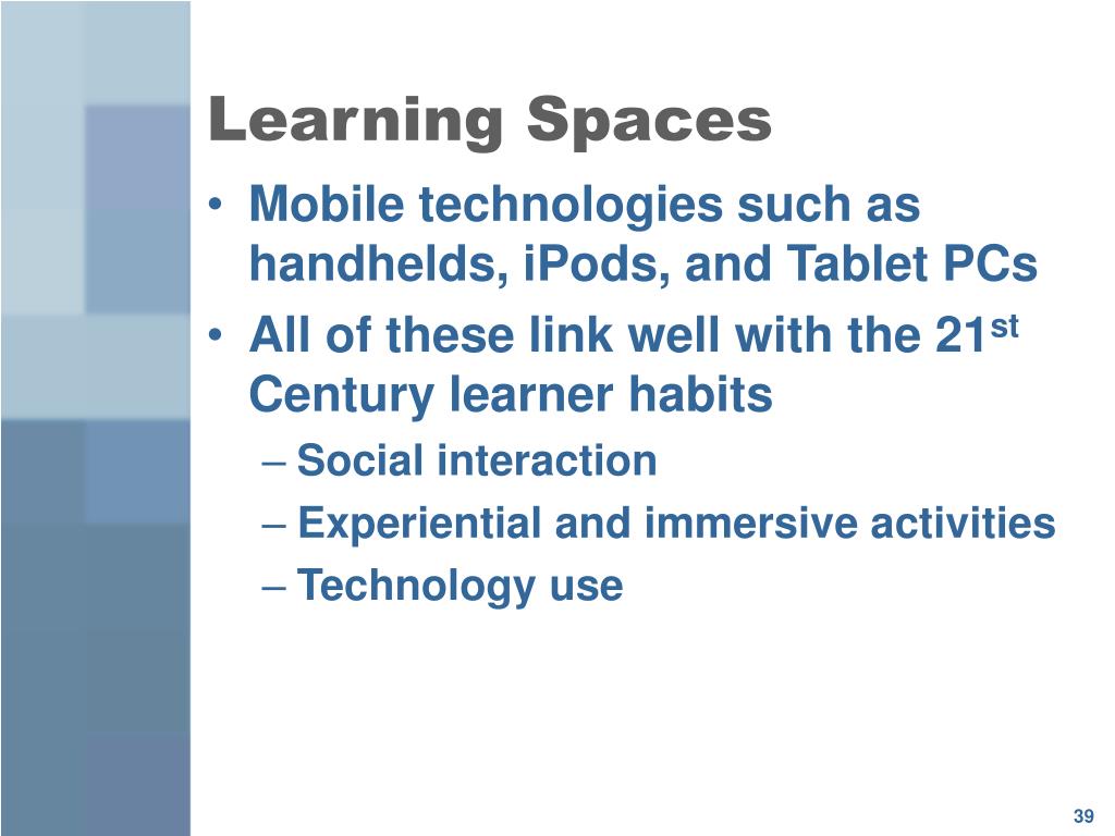 Learning Spaces • Mobile technologies such as handhelds, iPods, and Tablet PCs • All of these link well with the 21st Century learner habits • Social interaction • Experiential and immersive activities • Technology use