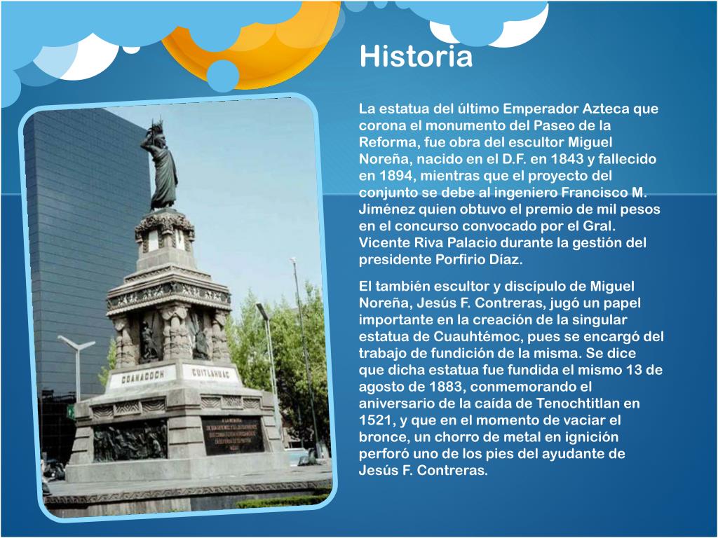 Historia La estatua del último Emperador Azteca que corona el monumento del Paseo de la Reforma, fue obra del escultor Miguel Noreña, nacido en el D.F. en 1843 y fallecido en 1894, mientras que el proyecto del conjunto se debe al ingeniero Francisco M. Jiménez quien obtuvo el premio de mil pesos en el concurso convocado por el Gral. Vicente Riva Palacio durante la gestión del presidente Porfirio Díaz. El también escultor y discípulo de Miguel Noreña, Jesús F. Contreras, jugó un papel importante en la creación de la singular estatua de Cuauhtémoc, pues se encargó del trabajo de fundición de la misma. Se dice que dicha estatua fue fundida el mismo 13 de agosto de 1883, conmemorando el aniversario de la caída de Tenochtitlan en 1521, y que en el momento de vaciar el bronce, un chorro de metal en ignición perforó uno de los pies del ayudante de Jesús F. Contreras.