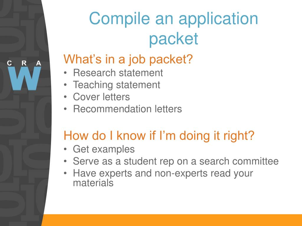 Compile an application packet What’s in a job packet? • Research statement • Teaching statement • Cover letters • Recommendation letters How do I know if I’m doing it right? • Get examples • Serve as a student rep on a search committee • Have experts and non-experts read your materials