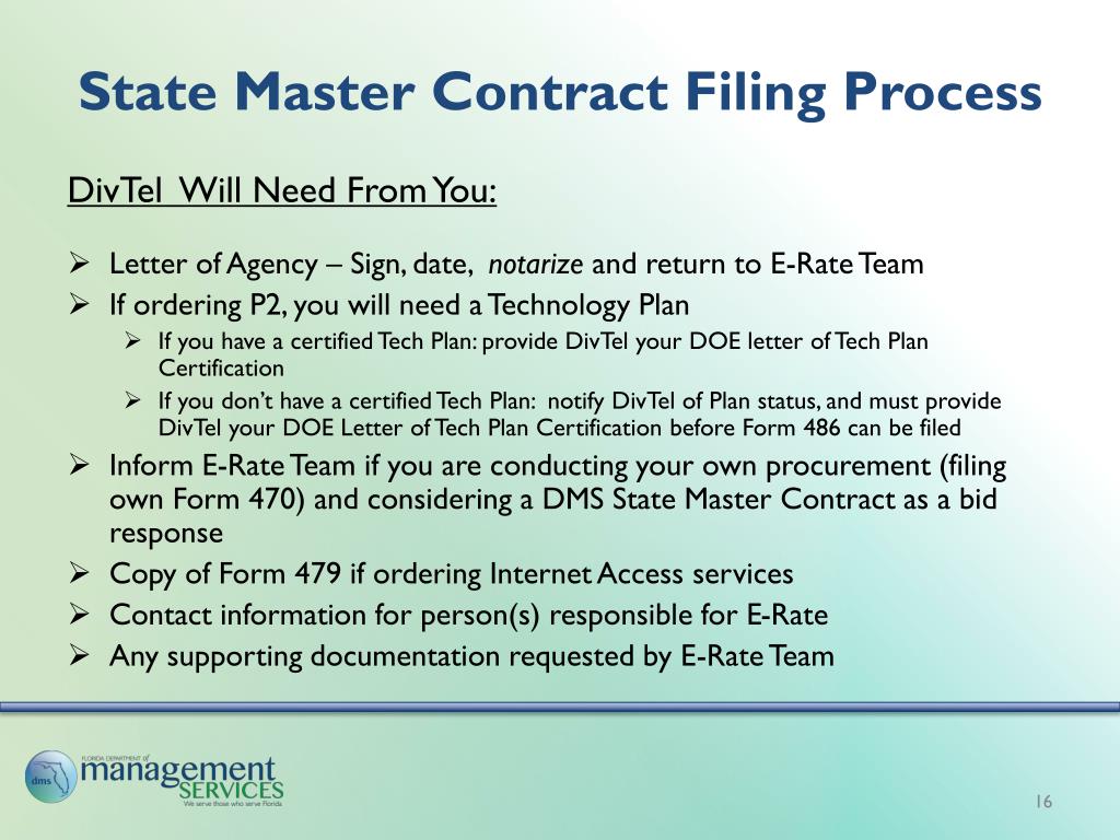 State Master Contract Filing Process DivTel Will Need From You: • Letter of Agency – Sign, date, notarize and return to E-Rate Team • If ordering P2, you will need a Technology Plan • If you have a certified Tech Plan: provide DivTel your DOE letter of Tech Plan Certification • If you don’t have a certified Tech Plan: notify DivTel of Plan status, and must provide DivTel your DOE Letter of Tech Plan Certification before Form 486 can be filed • Inform E-Rate Team if you are conducting your own procurement (filing own Form 470) and considering a DMS State Master Contract as a bid response • Copy of Form 479 if ordering Internet Access services • Contact information for person(s) responsible for E-Rate • Any supporting documentation requested by E-Rate Team