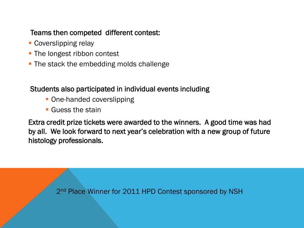 Teams then competed different contest: • Coverslipping relay • The longest ribbon contest • The stack the embedding molds challenge • Students also participated in individual events including • One-handed coverslipping • Guess the stain • Extra credit prize tickets were awarded to the winners. A good time was had by all. We look forward to next year’s celebration with a new group of future histology professionals. 2nd Place Winner for 2011 HPD Contest sponsored by NSH