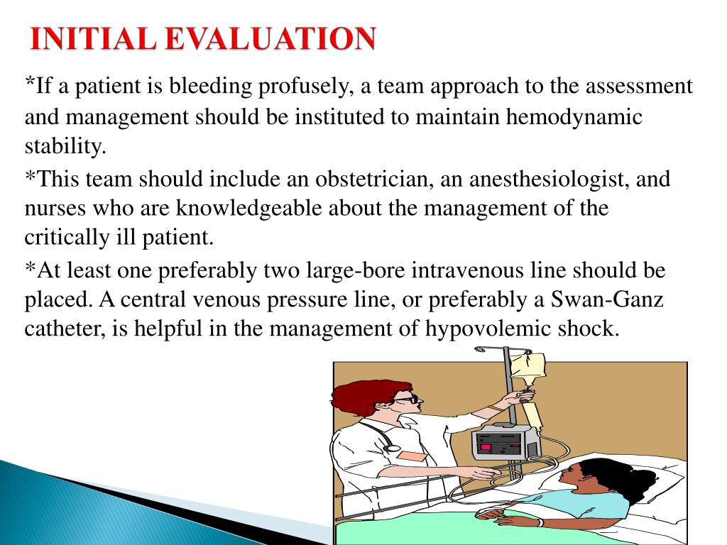 INITIAL EVALUATION *If a patient is bleeding profusely, a team approach to the assessment and management should be instituted to maintain hemodynamic stability. *This team should include an obstetrician, an anesthesiologist, and nurses who are knowledgeable about the management of the critically ill patient. *At least one preferably two large-bore intravenous line should be placed. A central venous pressure line, or preferably a Swan-Ganz catheter, is helpful in the management of hypovolemic shock.