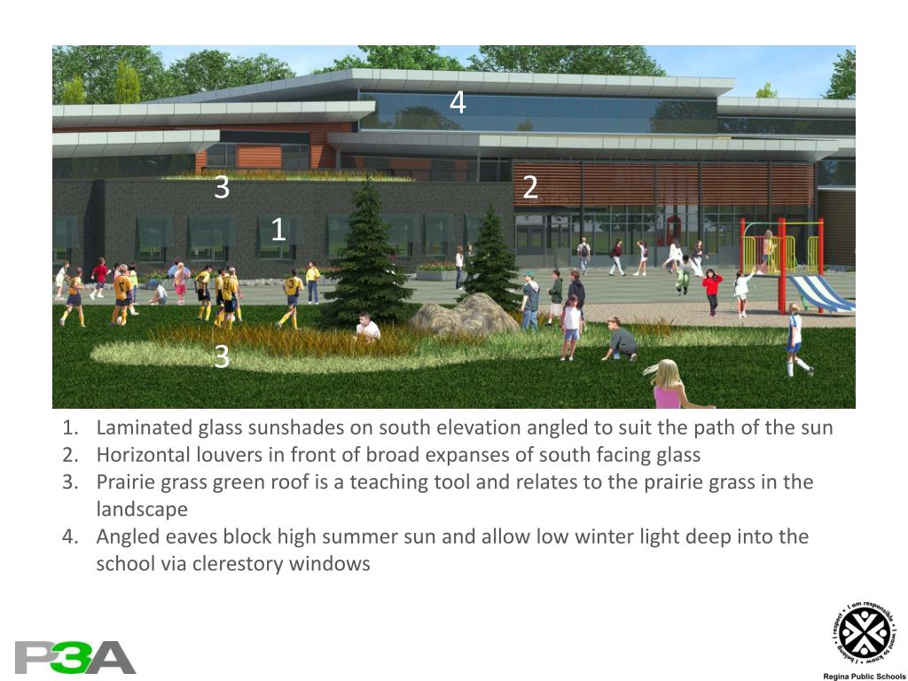 4 • 2 • 1 • 3 Laminated glass sunshades on south elevation angled to suit the path of the sun Horizontal louvers in front of broad expanses of south facing glass Prairie grass green roof is a teaching tool and relates to the prairie grass in the landscape Angled eaves block high summer sun and allow low winter light deep into the school via clerestory windows