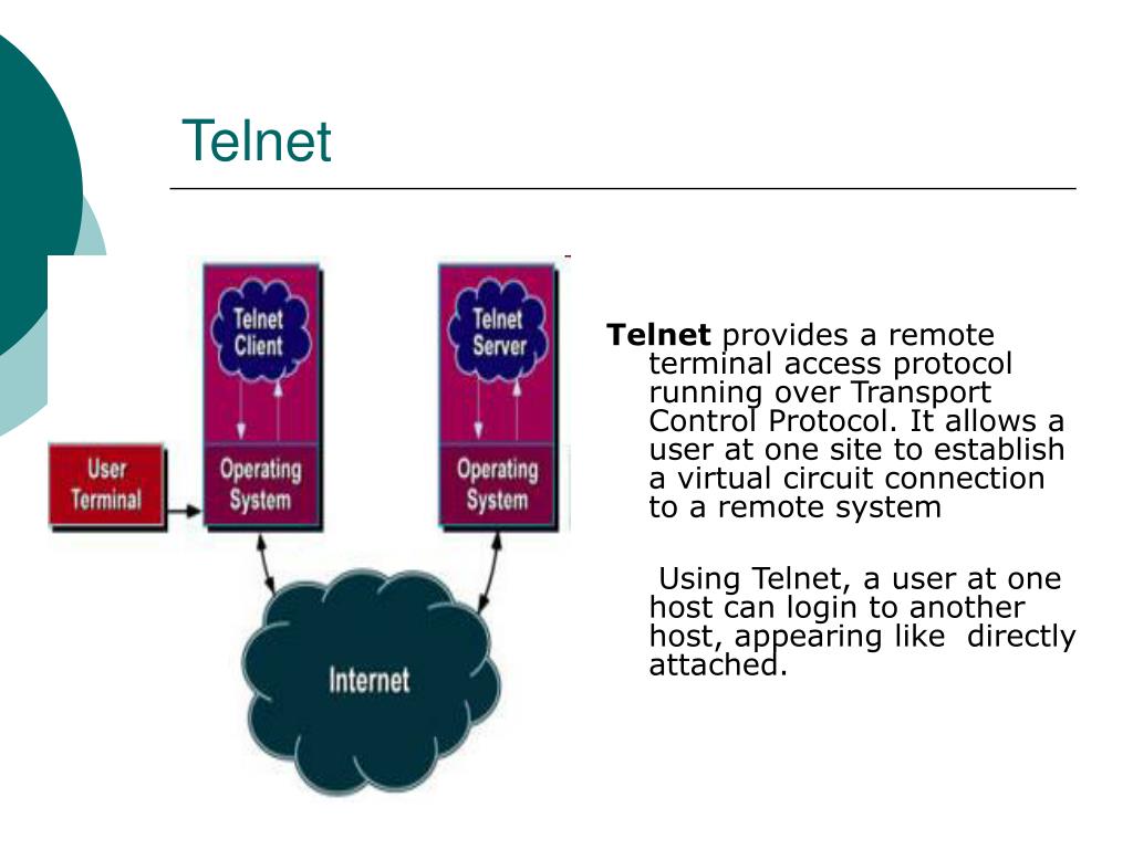 Telnet Telnet provides a remote terminal access protocol running over Transport Control Protocol. It allows a user at one site to establish a virtual circuit connection to a remote system Using Telnet, a user at one host can login to another host, appearing like directly attached.