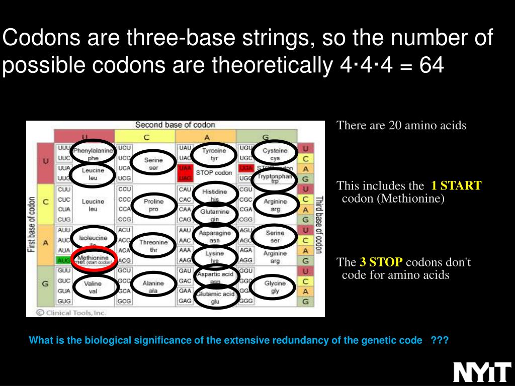 Codons are three-base strings, so the number of possible codons are theoretically 4·4·4 = 64 There are 20 amino acids This includes the 1 START codon (Methionine) What is the biological significance of the extensive redundancy of the genetic code ??? The 3 STOP codons don't code for amino acids