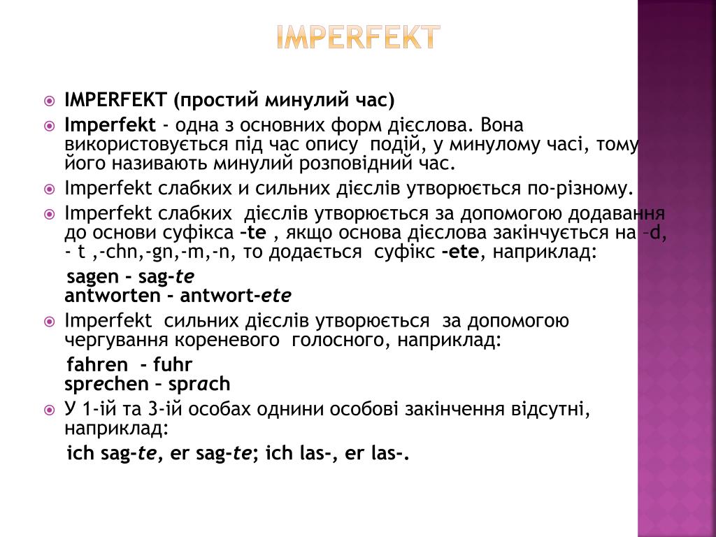 Imperfekt • IMPERFEKT (простийминулий час) • Imperfekt - одна зосновних форм дієслова. Вона використовуєтьсяпід час описуподій, у минуломучасі, тому йогоназиваютьминулийрозповідний час. • Imperfekt слабких и сильнихдієслівутворюєтьсяпо-різному. • Imperfekt слабкихдієслівутворюється за допомогоюдодавання до основисуфікса–te, якщо основа дієслова закінчується на –d, - t ,-chn,-gn,-m,-n, то додається суфікс-ete, наприклад: sagen - sag-teantworten - antwort-etе • Imperfekt сильнихдієслівутворюється за допомогоючергуваннякореневогоголосного, наприклад: fahren - fuhrsprechen – sprach • У 1-ій та 3-ій особах одниниособовізакінченнявідсутні, наприклад: ich sag-te, er sag-te; ich las-, er las-.