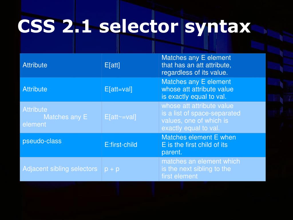 Attribute selectors • p[title] { color:#f00; } • div[class=error] { color:#f00; } • td[headers~=col1] { color:#f00; } • p[lang|=en] { color:#f00; }