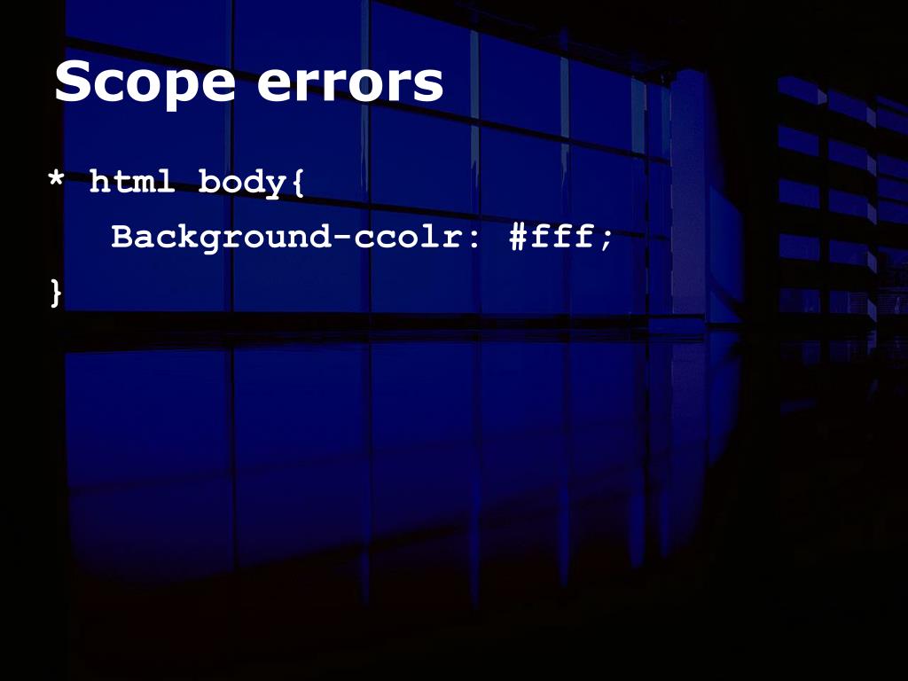 Scope errors • * html body{ • Background-ccolr: #fff; • }