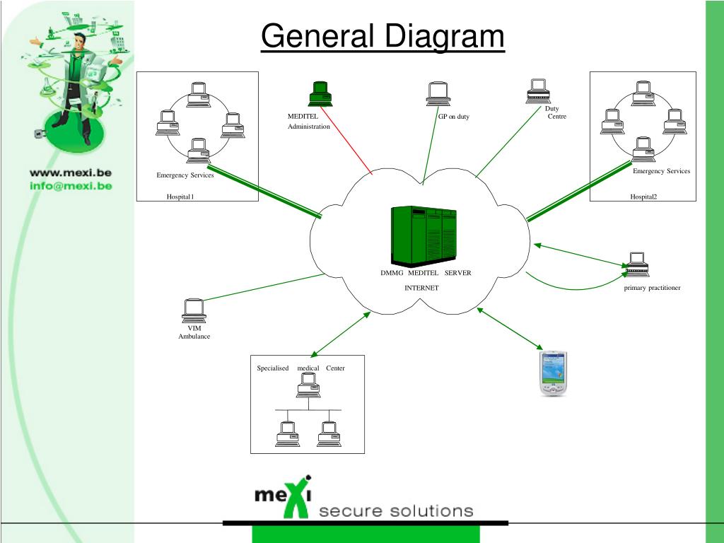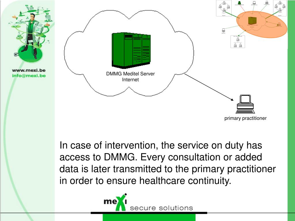 DMMG Meditel Server Internet primary practitioner In case of intervention, the service on duty has access to DMMG. Every consultation or added data is later transmitted to the primary practitioner in order to ensure healthcare continuity.