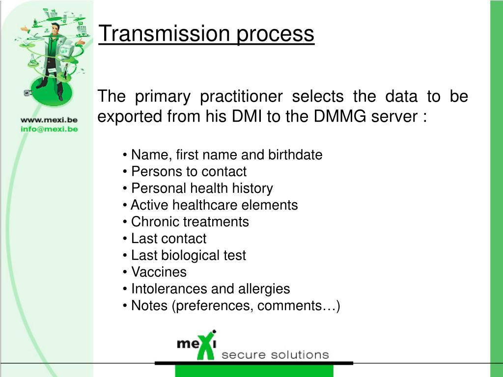 The primary practitioner selects the data to be exported from his DMI to the DMMG server : • Name, first name and birthdate • Persons to contact • Personal health history • Active healthcare elements • Chronic treatments • Last contact • Last biological test • Vaccines • Intolerances and allergies • Notes (preferences, comments…) Transmission process