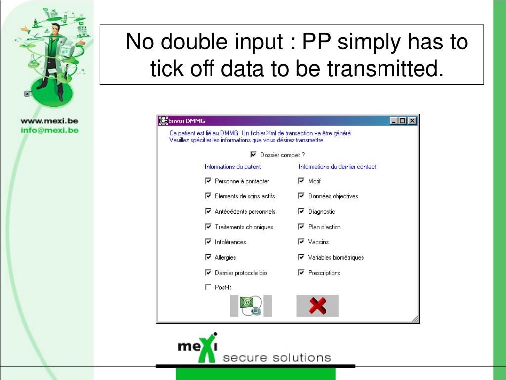 Security • Guaranteed by the meXi Secure Solutions software suite • Transmission of messages from DMI to DMMG is done by meXi Mail • Consultation of DMMG via an Internet browser is secured by meXi Tunnel • These two pieces of software use a public key infrastructure (PKI) based on asymmetrical encryption algorithms and on a certification process specific to the healthcare sector.